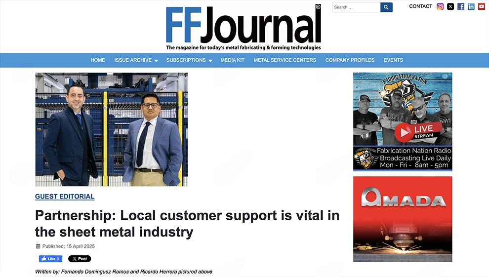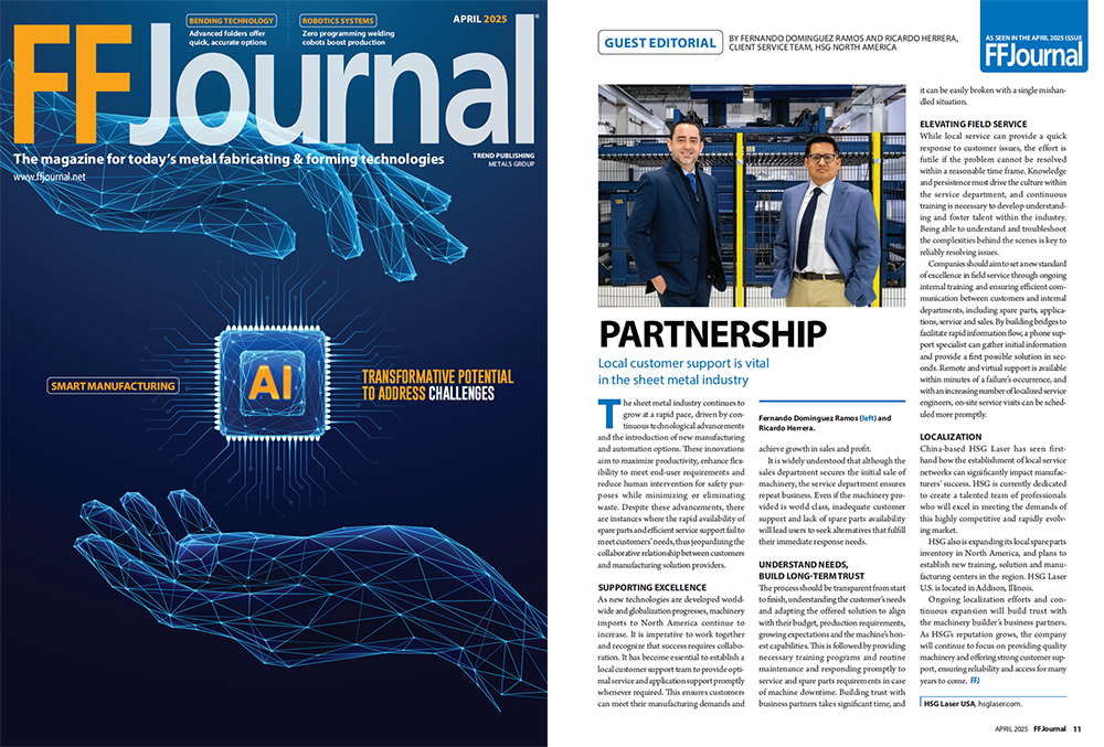 近日,宏山激光HSG Laser凭借在北美市场持续深化的本地化服务实践,荣登北美金属加工权威杂志《FFJournal》2025年4月刊。本期杂志特别刊载了由HSG北美区域团队成员Fernando与Ricardo联合撰写的专题文章,聚焦“合作伙伴关系”主题,系统阐述了本地化售后服务和备件保障对于制造企业运营效率与客户信任构建的重要价值。