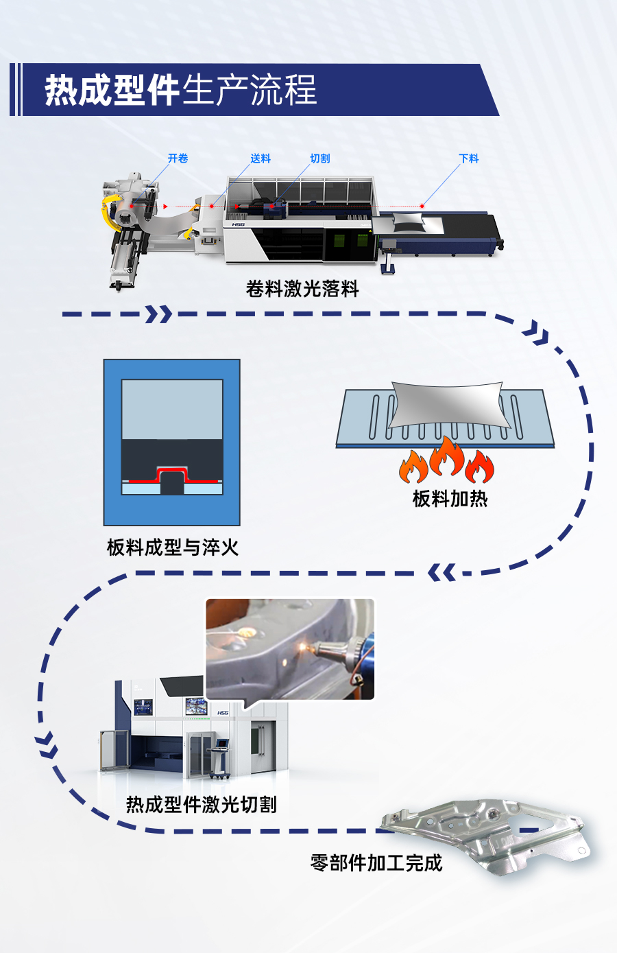 宏山激光GL系列卷料激光切割机搭配Cell系列三维五轴激光切割机,可实现高强钢料卷的自动化落料、以及热成型三维工件的高精度切割,从生产工序上助力实现轻量化目标。