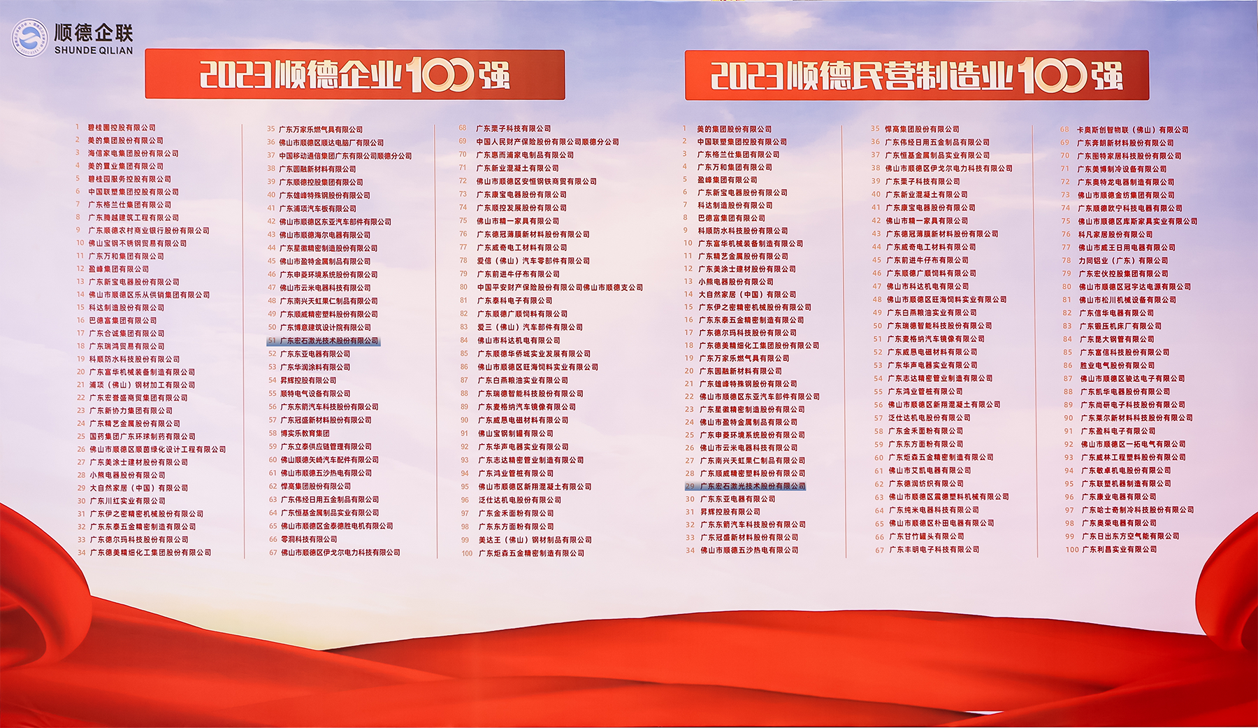 作为高新技术企业,宏山激光凭借过硬综合实力,继20212022年连续上榜后,再次荣登顺德企业100强榜,位列第51位。荣登2023顺德民营制造业100强榜,位列第29位。这不仅仅是宏山激光持续稳步发展的有力见证,更是对宏山激光追求高质量发展的一份肯定。