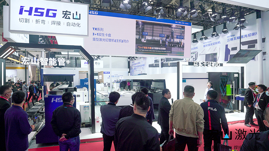 在宏山激光展位现场,占据C位的是荣获国家发明专利(ZL 2021 1 0887123.1)的3+1卡盘TX系列重型激光切管机,12米长整管切割,最后一刀可切图形,轻松实现0-45°坡口切割,支持槽钢、角钢、工字钢等型材切割,可承千钧“重”负,一“管”众山?。?br />