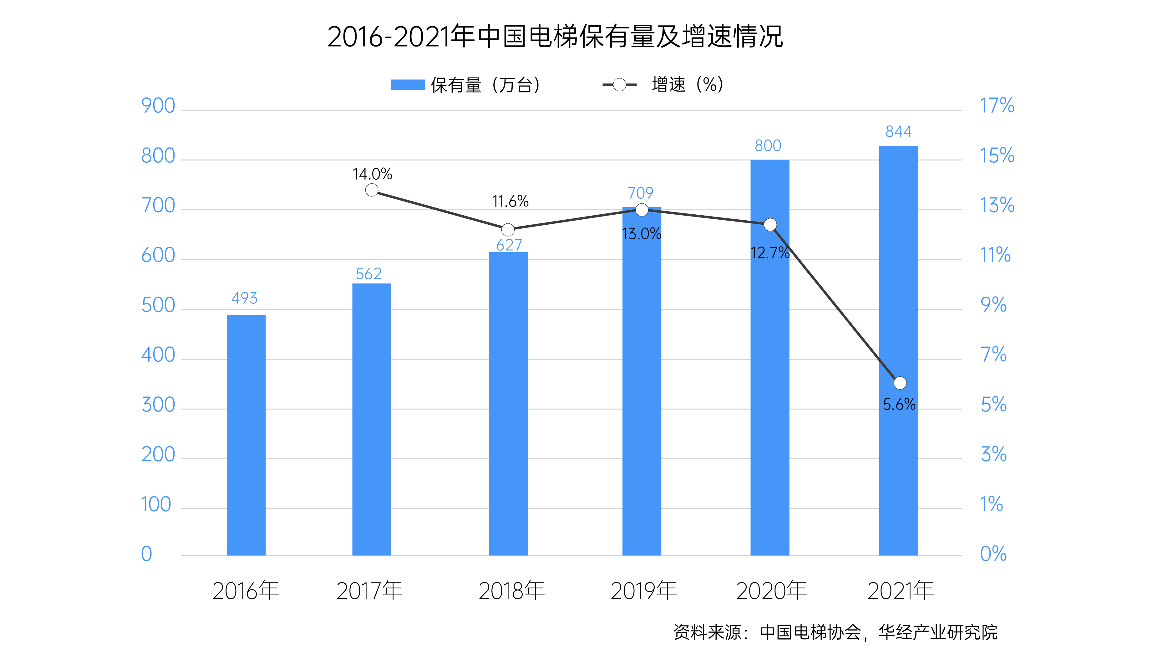 资料显示,2021年我国电梯保有量为844万台,同比增长5.6%。在人口基数较大,人均电梯使用保有率提升,以及人口老龄化加重,老旧小区持续推进电梯新装等背景下,我国电梯行业也迎来了增长的重要契机。
